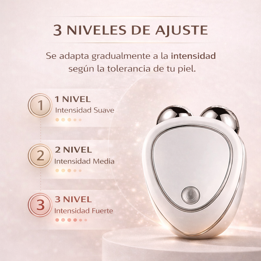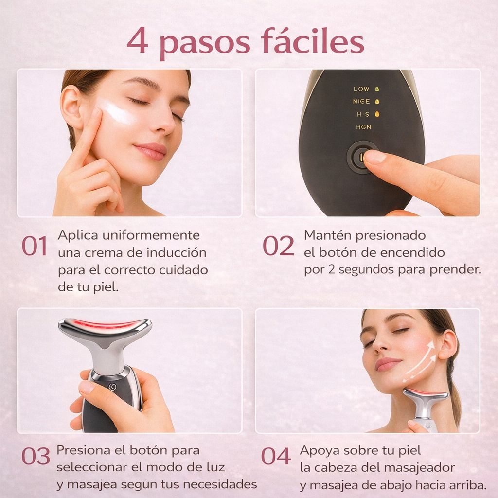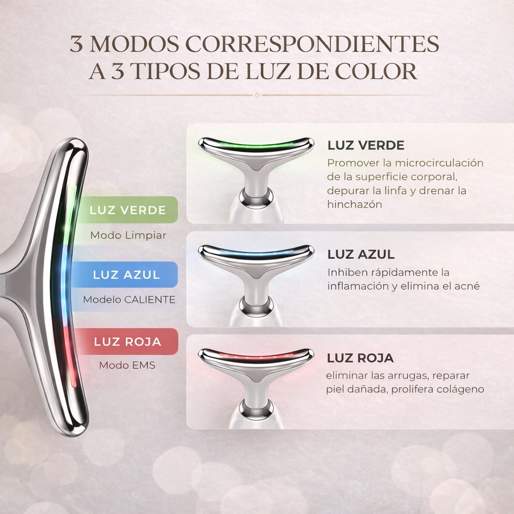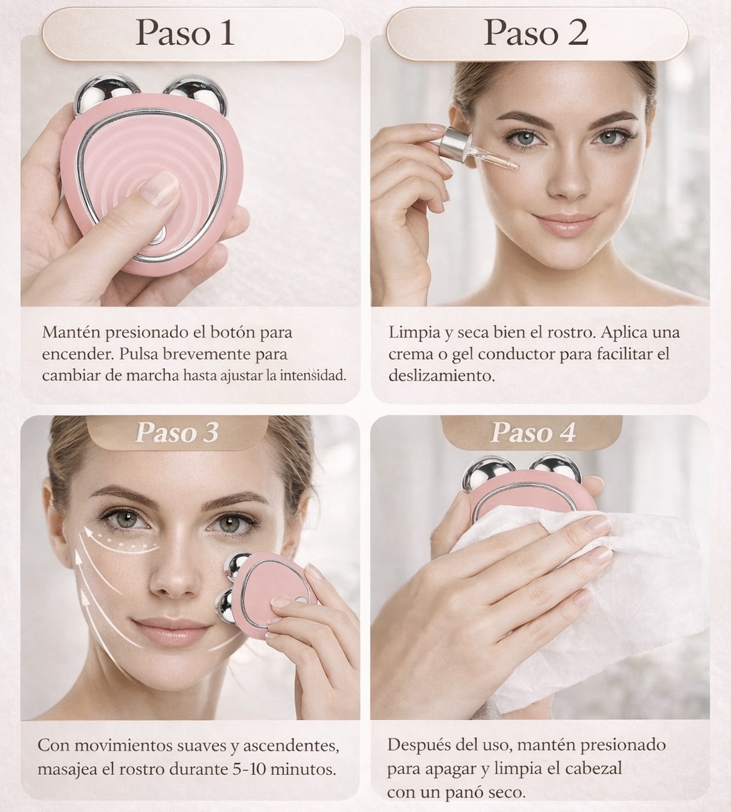 EMS “T”: Utiliza estimulación eléctrica de baja intensidad (EMS) para activar los músculos faciales y ayudar a mejorar la firmeza y el contorno con uso constante.