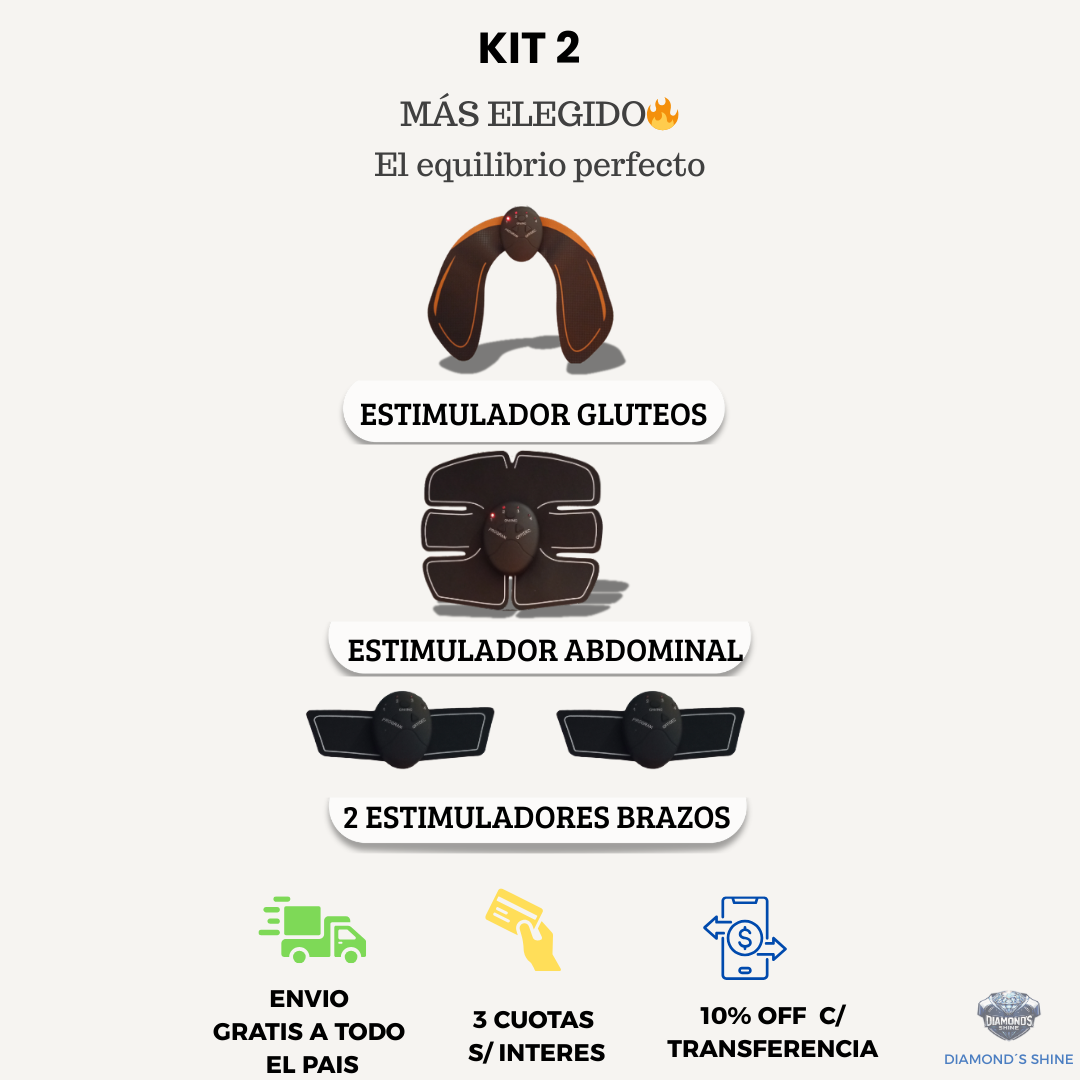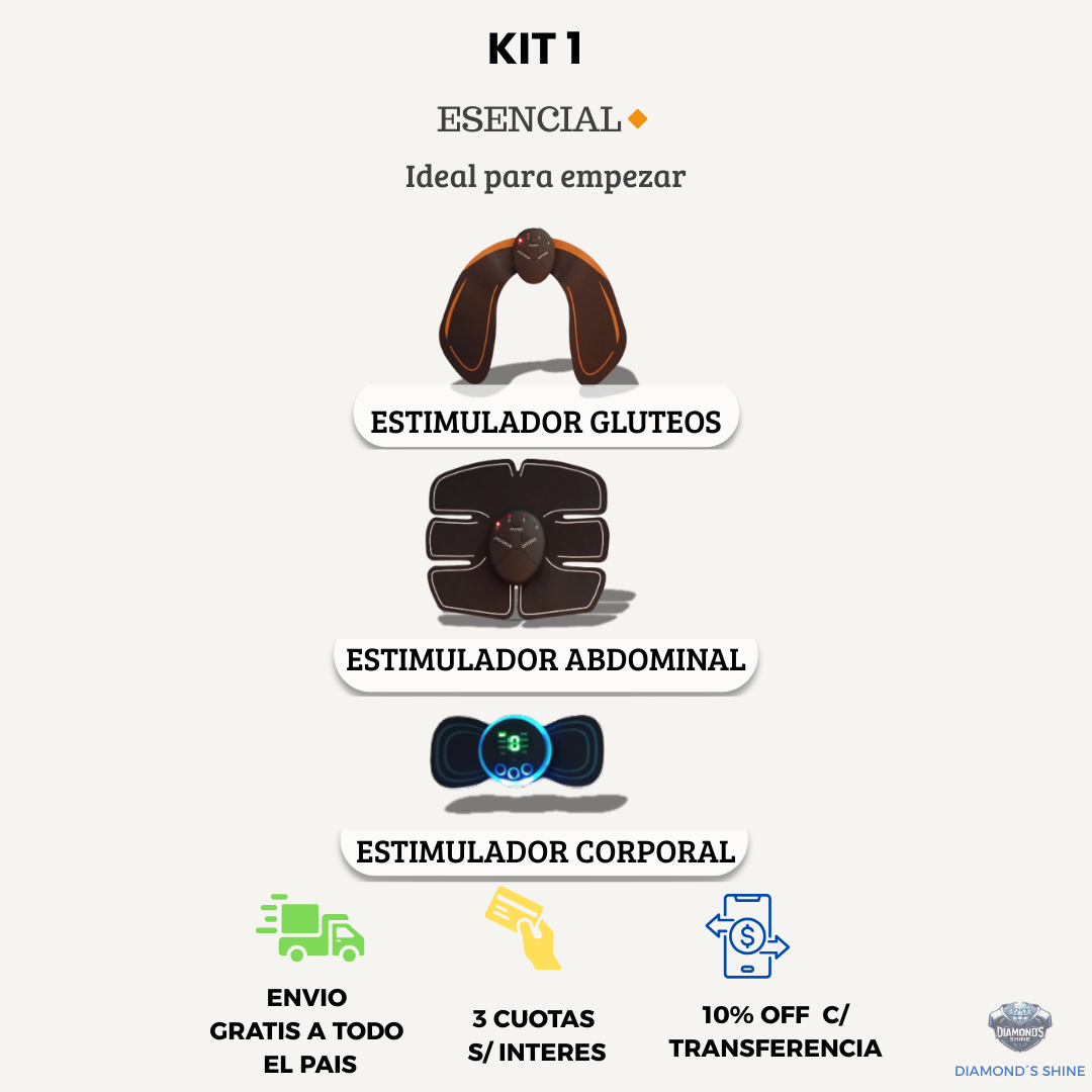 El Kit 1 combina electroestimulación y activación muscular para ayudar a tonificar, mejorar la firmeza y sumar constancia a tu rutina desde casa.